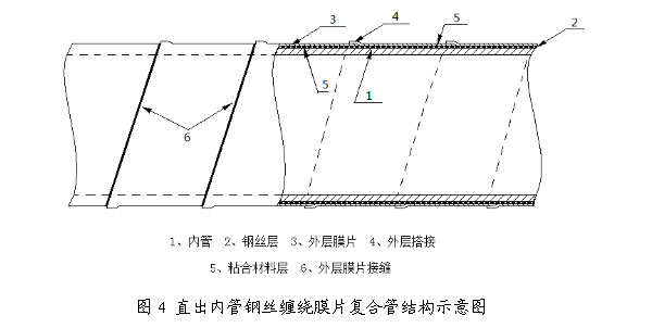 超高分子钢丝网骨架聚乙烯复合管材由直出内管、钢丝和外层膜片三种材料复合而成,适用于大、中口径的中、高压管。管材在生产时先在超高管材挤出机上直接挤出改性乐玩内管,然后再在内管上热熔复合钢丝和超高膜片。管材结构如图4所示。