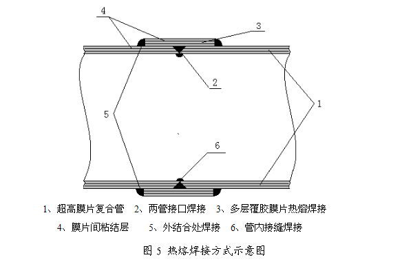 将要连接的两根管材接头打磨出45°斜口,对正后用聚乙烯塑料焊枪沿V型槽焊接一周,待焊接材料冷却后打磨平整。取宽度为管道壁厚10倍以上、表面已覆粘合材料的带状超高膜片作为焊接基材,用超高膜片焊接机沿接缝加热、加压、缠绕焊接多圈超高膜片带。焊接膜片的总厚度不小于管道壁厚,使该连接处强度大于管体本身。再将膜片带两侧与管材外结合处用聚乙烯焊枪焊接起来。然后把大口径管材内部接缝再用聚乙烯焊枪焊接一遍。连接方法如图5所示。